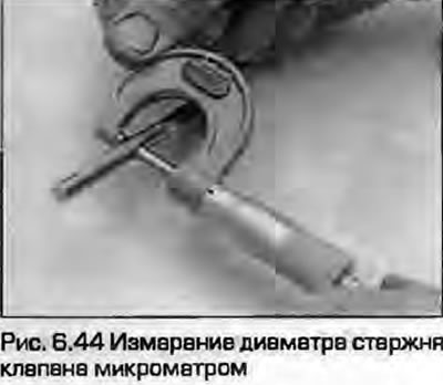 44. Праверце клапаны візуальна на адсутнасць зносу. Змен дыяметраў стрыжняў, задиров і глыбокіх драпін на іх не павінна быць. Мікраметрам вымерайце дыяметр стрыжня клапана ў некалькіх месцах па ўсёй даўжыні (мал. 6.44).
