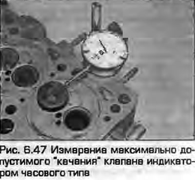 47. Устаўце клапан у сваю накіроўвалую ўтулку і ўмацуйце побач з талеркай індыкатар гадзіннікавага тыпу. Высуньце клапан з утулкі настолькі, каб яго пятка ўсталявалася заподлицо з тарцом утулкі. Вымерайце ход качання клапана ва ўтулцы (мал. 6.47).