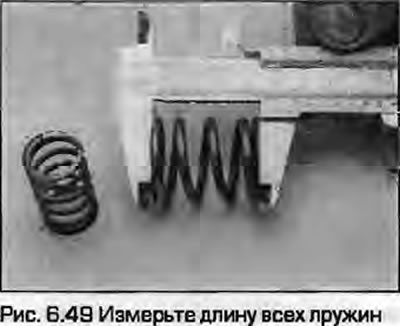 49. Вымерайце штанген-цыркулем даўжыню кожнай спружыны. Паколькі даўжыня спружын Спецыфікацыямі не прадпісваецца, застаецца адзіны спосаб - параўнаць даўжыню старой спружыны з даўжынёй новай. Звернеце ўвагу на тое, што затамкавыя спружыны звычайна пры капітальным рамонце замяняюцца (мал. 6.49).