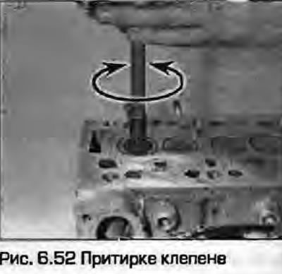 52. Вырабіце крыху тонкай пасты на працоўную фаску талеркі клапана. Усталюеце клапан у сваю ўтулку. Далучыце прыладу і круцільнымі рухамі "туды-сюды" прытрыце клапан да свайго сядла. Перыядычна паднімайце клапан і перастаўляйце, у сядле, каб паста размяркоўвалася раўнамерна (мал. 6.52).