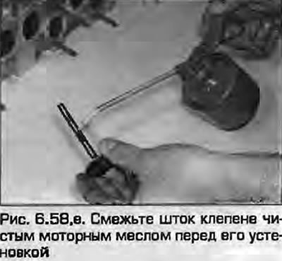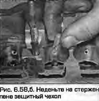 58. Дзейнічаючы з кожным клапанам па чарзе, вышмаруйце стрыжні клапанаў чыстым маторным маслам і ўстаўце іх у накіравальныя ўтулкі. Надзеньце адзін з ахоўных пластыкавых чахлоў, укладзеных у камплект маслосъемных каўпачкоў на стрыжань клапана, каб абараніць каўпачок пры ўсталёўцы (мал. 6.58, а, б).