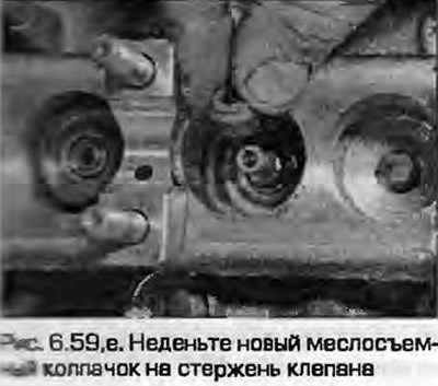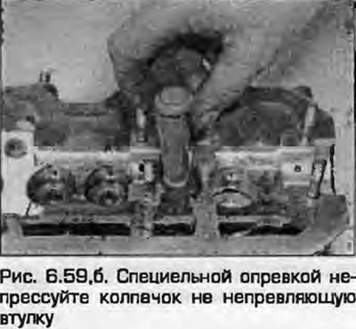 59. Пагрузіце новы маслосъемный каўпачок у чыстае маторнае масла, надзеньце яго на стрыжань клапана і праштурхніце накіроўвалай утулкі. З дапамогай галоўкі або спецыяльнай апраўкі запрасуйце каўпачок на ўтулку (мал. 6.59). Зніміце ахоўны чахольчык.