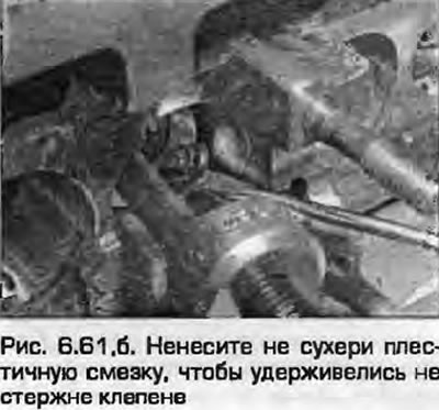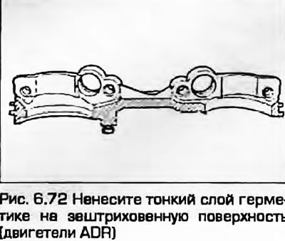72. Вырабіце тонкі пласт герметыка на стыкоўную паверхню перадпакоя камбінаванага вечка і ўсталюеце яе так, каб сальнікі на перакасіліся (мал. 6.72). Паступова зацягніце ніты мацавання вечка загаданым момантам.
