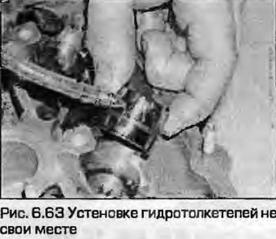 63. Вышмаруйце штурхачы звонку чыстым маторным маслам і ўсталюеце іх на месцы. Праштурхніце іх, злёгку пакруціце да ўпора ў клапаны, пасля чаго вышмаруйце якія кантактуюць з кулачкамі паверхні (мал. 6.63).