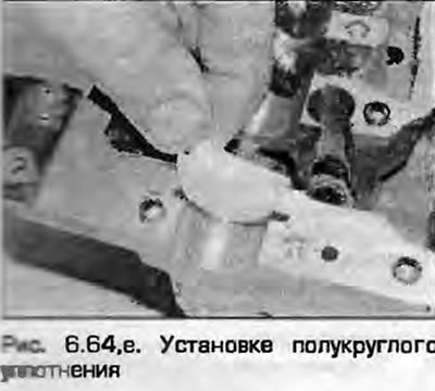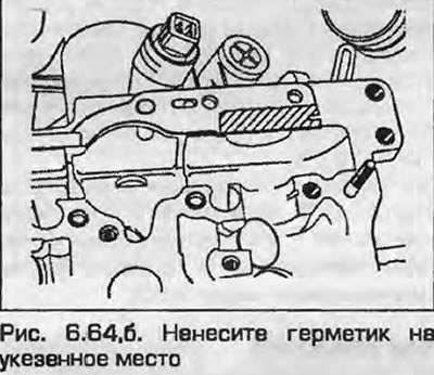 54. Абкладзеце гумовую/металічную пракладку на аўтаматычны рэгулятар фазы разам з паўкруглым ушчыльненнем (мал. 6.64, a, б) у пярэдняй частцы галоўкі цыліндраў. Калі на пракладцы герметык не нанесены, вырабіце трохі падыходнага герметыка ў паказаную вобласць (мал. 6.64).