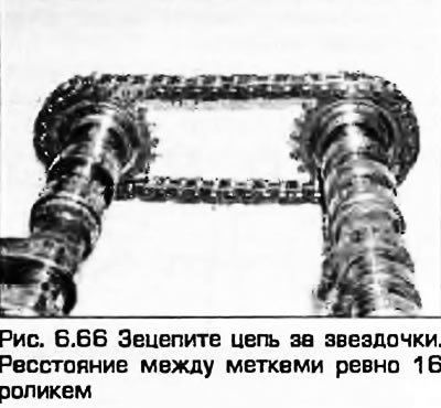 66. Зачапіце за зорачкі распредвалов ланцуг так, каб паміж пазнакамі зорачак было 16 ролікаў (мал. 6.66). Усталюйце рэгулятар паміж плячыма мэты і акуратна апусціце распредвалы на свае месцы ў галоўка цыліндраў, падтрымліваючы распредвалы за канцы, каб не пашкодзіць шыйкі і кулачкі. Дзейнічаючы іншым спосабам, можна абкласці распредвалы разам з ланцугом у галоўку цыліндраў, пасля чаго злёгку прыпадніміце распредвалы за зорачкі, каб усталяваць рэгулятар.