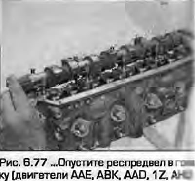 77. Акуратна апусціце распредвал у галоўку цыліндраў кулачкамі першага цыліндра ўверх. Пры ўстаноўка трымайце распредвал за тарцы паралельна галоўцы, каб не пашкодзіць апорныя паверхні (мал. 6.77).