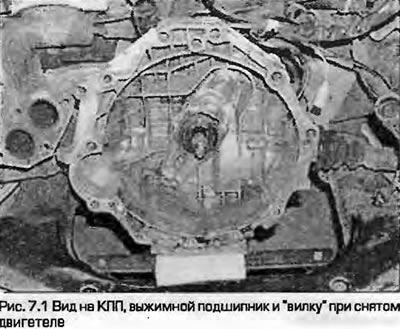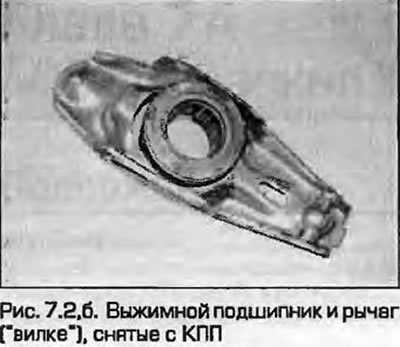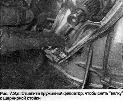 2. Адвёрткай акуратна адчэпіце відэлец ад шарнірнай стойкі ўсярэдзіне звона. Зніміце рычаг разам з выціскным падшыпнікам з накіроўвалага рукава (мал. 7.2, а, б).