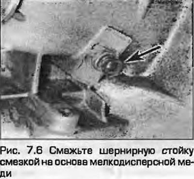6. Вышмаруйце шарнірную стойку і пластыкавую накладку невялікай колькасцю высокатэмпературнай змазкі на аснове дробнадысперснай медзі (мал. 7.6). Вырабіце тонкі пласт змазкі на якая кантактуе паверхню выціскнага падшыпніка, пялёсткі дыяфрагмы. відэльцы і на накіроўвалую ўтулку.