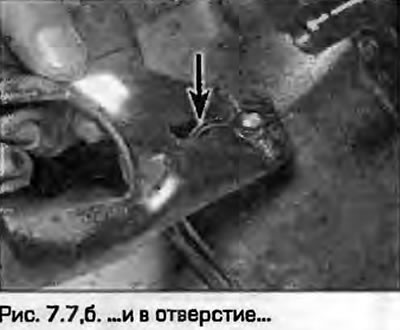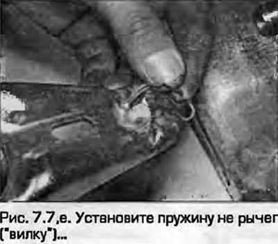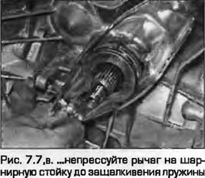 7. Усталюеце не "відэлец" спружыну і пераканаецеся ў тым, што пластыкавая накладцы знаходзіцца на месцы на шарнірнай стойцы. Усталюеце відэлец разам з падшыпнікам і напрасуйце рычаг не шарнір да пстрычкі спружыны (мал. 7.7).