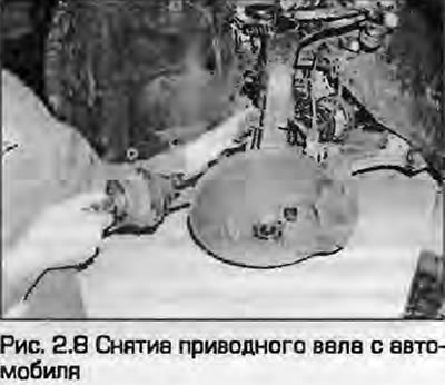 8. Адагніце паваротны кулак назад, каб адлучыць унутраны шарнір ад фланца трансмісіі. Адвядзіце шарнір у бок і вывядзіце вонкавы шарнір з шлицевого злучэнні са ступіцай. Выдаліце вал з-пад аўтамабіля (мал. 2.8). Калі прадугледжана, зніміце пракладку з паверхні ўнутранага шарніра і выкінеце яе - для ўсталёўкі вам патрабуецца новая.