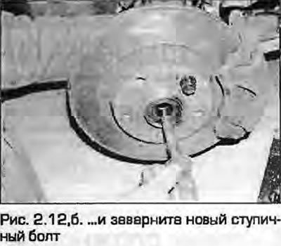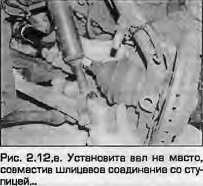 12. Усталюйце вал на сваё месца, сумясціўшы шлицевое злучэнне са ступіцай. Усталюеце новы ступичный ніт і зацягніце яго "ад рукі" (мал. 2.12, а, б).
