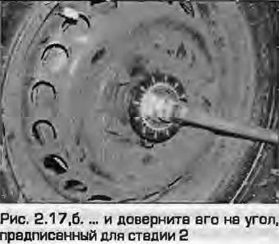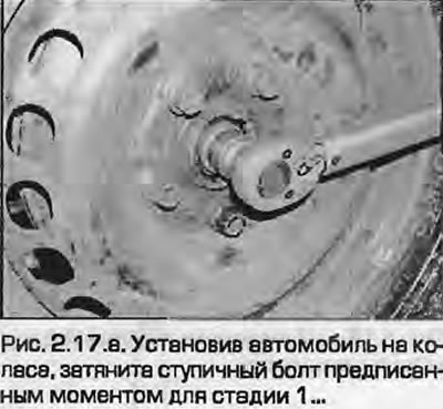 17. Усталяваўшы аўтамабіль на колы, потым зацягніце ступичный ніт загаданым момантам для стадыі 1, пасля чаго давярніце яго на кут, прадпісаны для стадыі 2, ужыўшы для гэтага кутамерную асадку (мал. 2.17, а, б). Калі вугламернай асадкі няма, вырабіце на калодку перад зацяжкай кутнія пазнакі, каб выканаць тэхналогію.
