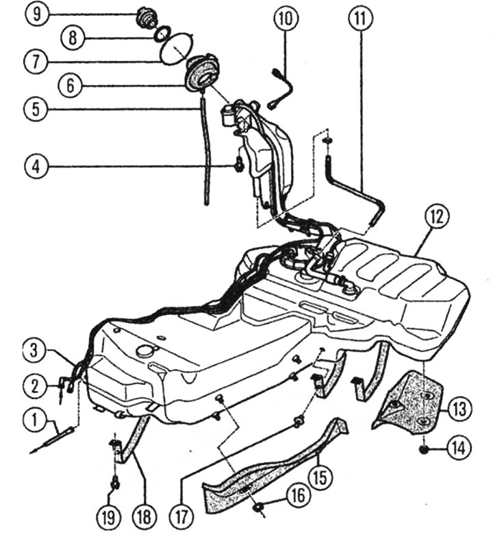 Паліўны бак з мантаванымі на ім дэталямі: 1 - які падае паліваправод ад паліўнага фільтра да рухавіка, 2 - зваротны паліваправод ад рухавіка, 3 - паветраадводны трубаправод да бачка з актываваным вуглём, 4 - шруба 23 Нм для мацавання наліўной гарлавіны і злучэнні з корпусам, 5 - пераліўны шланг, 6 - гумовы пак, 9 - вечка, 10 - злучэнне з корпусам для адводу статычных зарадаў. 11 - паветраадводны трубаправод, 12 - паліўны бак, 13 і 15 - цеплаахоўныя шчыткі, 14 і 16 - гайка 2 Нм, 17 - распорный заціск, 18 - стяжная стужка, 19 - шруба 23 Нм.