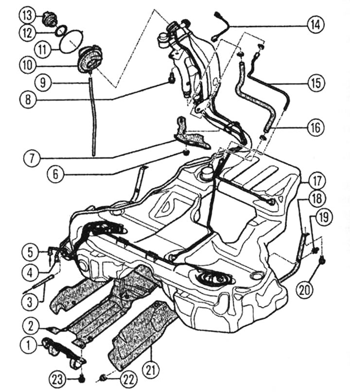 Паліўны бак для аўтамабіляў з поўным прывадам са змантаванымі на ім дэталямі: 1 - трымальнік для сістэмы выпуску ОГ, 2 - апорны ліст, 3 - падае топливопровод ад паліўнага фільтра да рухавіка, 4 - воздухоотводящий трубаправод да бачка з актываваным вуглём, 5 - зваротны топливопровод ад рухавіка, 6 - гайка 2 Нм, 7 - цеплаахоўны шчыток, 8 - шруба 23 Нм для мацавання наліўны гарлавіны і злучэння з корпусам, 9 - пераліўнай шланг, 10 - гумовы каўпак, 11 - заціскная кольца, 12 - ўшчыльняльнае кальцо, 13 - вечка, 14 - злучэнне з корпусам для адводу статычных зарадаў, 15 і 16 - воздухоотводящий трубаправод, 17 —паліўны бак, 18 - стяжная стужка, 19 —спружынны заціск, 20 - шруба 23 Нм, 21 - цеплаахоўны шчыток, 22 - гайка 2 Нм, 23 - шруба 23 Нм.