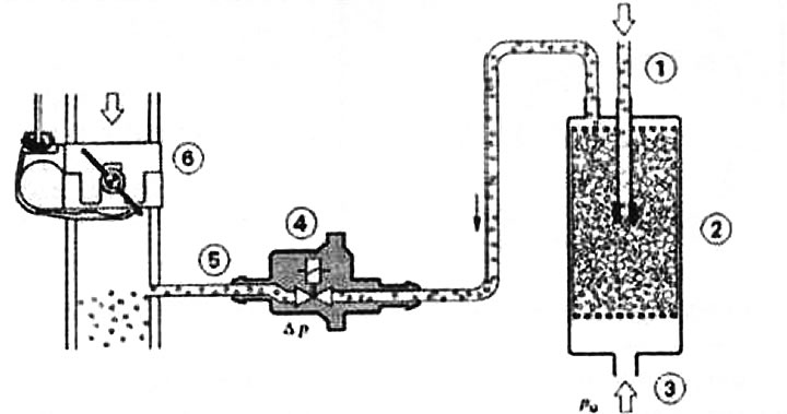 Прынцып дзеяння бачка з актываваным вуглём: 1 - трубаправод ад паліўнага бака да бачка з актываваным вуглём, 2 - бачок з актываваным вуглём, 3 - свежае паветра, 4 - клапан рэгенерацыі, 5 - трубаправод да впускнога газаправода, 6 - дроселіруючая прылада з дросельнай засланкай.