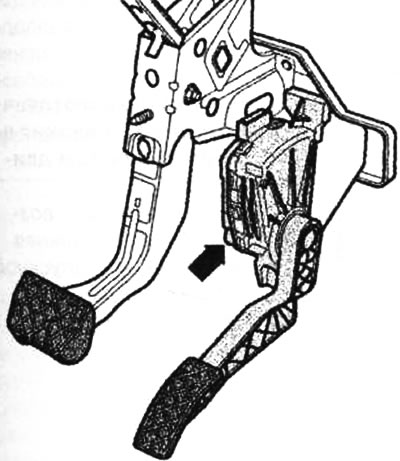 Электронная педаль акселератара (для прыкладу паказаны рухавік 3,0 л ASN). У модулі педалі акселератара (стрэлка) знаходзяцца два датчыка становішча педалі акселератара: G79 і G185.