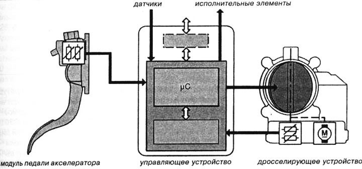 Палажэнне педалі акселератара, якое вызначаецца кіроўцам, з'яўляецца галоўнай уваходнай велічынёй для кіраўніка прылады. Дросельная засланка прыводзіцца ў рух з дапамогай электрарухавіка (рэгулятара становішча дросельнай засланкі), які размешчаны ў прыладзе кіравання дросельнай засланкай. Упраўленне вырабляецца ва ўсім дыяпазоне нагрузак і частот кручэння. Засланка прыводзіцца ў рух рэгулятарам у адпаведнасці з сігналам ад задатчыка, у якасці якога выступае кіравальная прылада рухавіка.