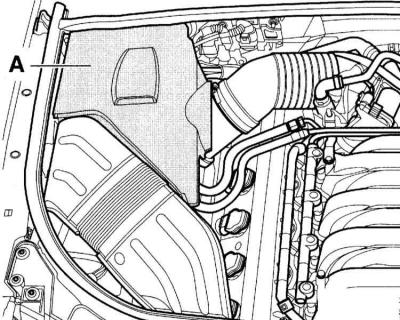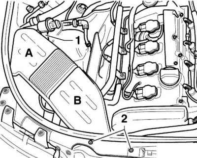 2. Выміце наверх канал усмоктвання паветра (А). Для гэтага выміце планку (1), калі яна маецца, з трымальніка адсорбера пароў бензіну.
