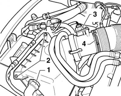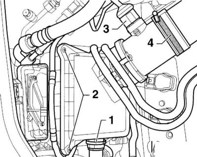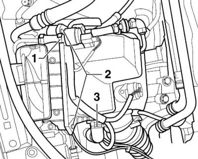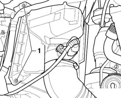 1. Вызваліце хамут мацавання шланга (1) і адлучыце провад ад клапана адсорбера пароў бензіну.