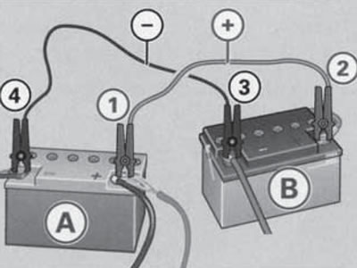 Падлучыце канец аднаго провада (звычайна чырвонага колеру) да станоўчай клемы разраджанай батарэі. Другі канец гэтага провада падлучыце да дадатнай клемы дапаможнай батарэі (гл. ілюстрацыю 12). Адзін канец другога провада (звычайна чорнага колеру) падлучыце да адмоўнай клемы дапаможнай батарэі ці да кропкі масы (напрыклад, да блока цыліндраў) аўтамабіля-донара.