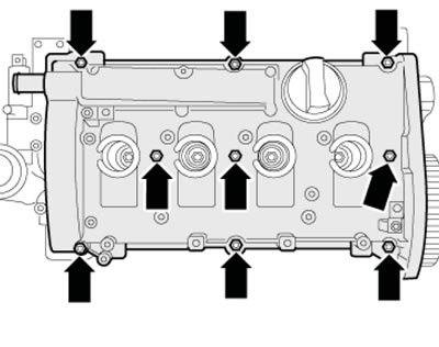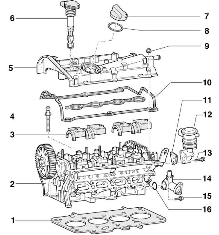34.1. Дэталі ўстаноўкі галоўкі цыліндраў і яе вечкі 1. Пракладка галоўкі цыліндраў; 2. Галоўка цыліндраў; 3. Вечкі падшыпнікаў размеркавальных валаў; 4. Размеркавальнікі рухальнага алею; 5. Вечка галоўкі цыліндраў; 6. Шпулька запальвання; 7. Вечка маслозаливной гарлавіны; 8. Пракладка крышкі 7; 9. Гайкі мацавання крышкі галоўкі цыліндраў, 9 Нм; 10. Пракладка крышкі 5; 11. Пракладка клапана 12, падлягае замене; 12. Камбінаваны клапан SAI; 13. Ніты мацавання клапана 12, 10 Нм; 14. Фланец астуджальнай вадкасці з датчыкам ЕСТ; 15. Ніты мацавання фланца 14, 10 Нм; 16. Ушчыльняльнае кольца фланца 14, падлягае замене