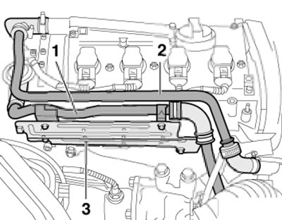 5. Зніміце трубку PCV (2 на ілюстрацыі) і шланг PCV з крышкі галоўкі цыліндраў. Адлучыце трубку (1) камбінаванага клапана SAI ад вечка галоўкі цыліндраў і тэрмаахоўнага экрана (3). Адхіліце трубку SAI злёгку ў бок.