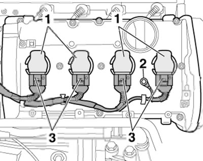 6. Адлучыце провад масы (2 на ілюстрацыі), раз'яднайце раздымы (3) і адкладзіце праводку ў бок. Выцягніце шпулькі запальвання (1).