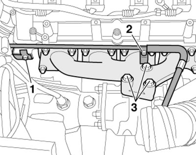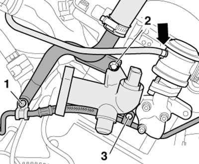 22. Адлучыце вакуумны шланг (стрэлка на ілюстрацыі) ад камбінаванага клапана SAI, зніміце фланец астуджальнай вадкасці (балты 2 і 3) і вывярніце ніт (1) мацаванні кранштэйна якая падае алейнай лініі. Адлучыце ад галоўкі цыліндраў усё электраправодку і адкладзяце яе ў бок. Адлучыце шланг радыятара кліматычнай сістэмы на заднім боку галоўкі цыліндраў (мацуецца фіксатарам на фланцы).