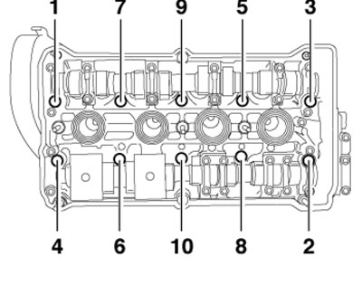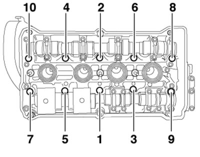 35. Абкладзеце пракладку галоўкі цыліндраў на цэнтравальныя штыфты ў блоку цыліндраў (нумар пракладкі павінен чытацца з боку ўпускаючы). Абкладзеце на блок цыліндраў галоўку цыліндраў і ўкруціце ўсе новыя ніты яе мацавання ад рукі. Затым зацягніце балты мацавання галоўкі цыліндраў у тры падыходу ў паслядоўнасці (1-10 на ілюстрацыі), на першым этапе - з высілкам 40 Нм, а на другім і трэцім этапах - кожны раз дацягніце ніты на кут 90°.