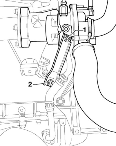 34. Вывярніце балты (1 і 2 на ілюстрацыі) кранштэйна турбакампрэсара на два абарачэння, каб не дапусціць узнікнення высілкаў пры ўсталёўцы галоўкі цыліндраў.