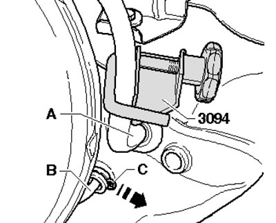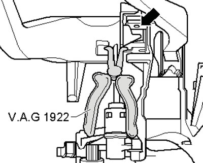 8. Адлучыце шток галоўнага цыліндра ад педалі счаплення. Для гэтага сцісніце абцугамі VAG1922 бакі фіксатара і аддзеліце педаль счаплення ад галоўнага цыліндру (гл. супр. ілюстрацыю).