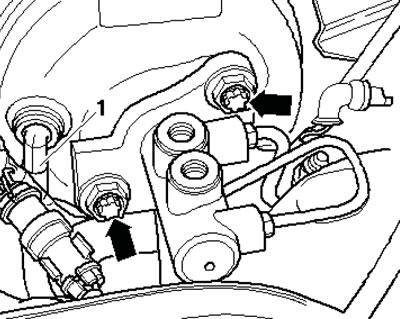 5. Зніміце вакуумную трубку, якая вядзе да ўзмацняльніка тармазоў (1 на ілюстрацыі) і вывярніце два ніта (стрэлкі), нахіліўшы рэзервуар тармазной вадкасці.