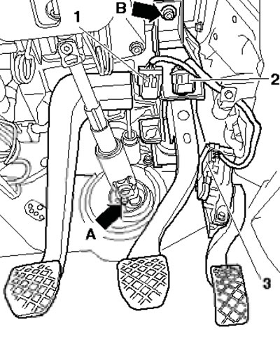 7. Аддзеліце рулявую калонку ад рулявога механізму (А на ілюстрацыі, гл. Главу 10), раз'яднайце раздымы датчыка педалі счаплення (1), Д/У стоп-сігналаў (2) і модуля педалі газу (3). Пры адпаведнай камплектацыі раз'яднайце раздым датчыка дазволу пуску рухавіка. Вывярніце ніт (У) кранштэйна і зніміце зборку педаляў.