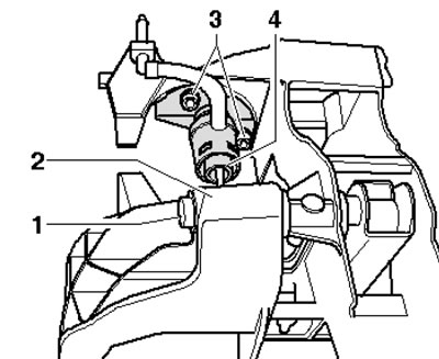 9. Аддзяліце фіксатар (1 на ілюстрацыі), зніміце педаль счаплення (2), вывярніце ніты (3) і зніміце галоўны цыліндр (4).