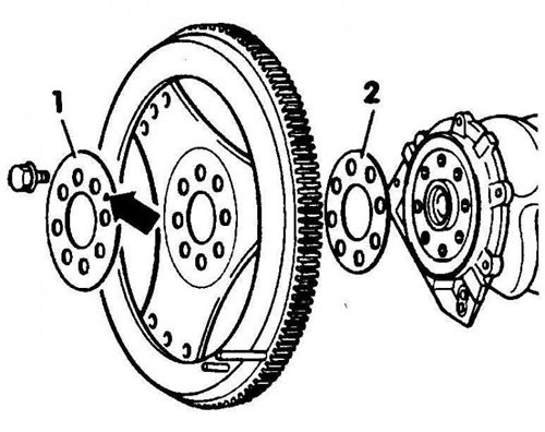 Прамежкавая шайба (1) і пракладка (2) кіроўнага дыска аўтаматычнай каробкі перадач