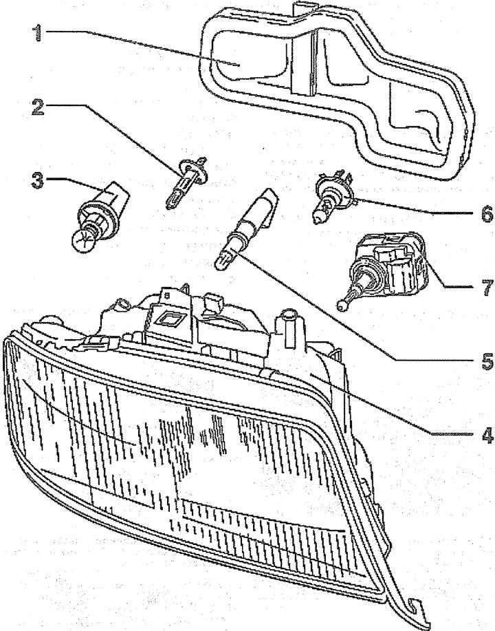 5 - лямпачка стаяначнага святла (5 Вт) 6- лямпачка далёкага святла - Н7 (55 Вт)