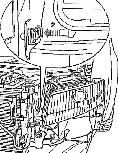 3. Выкруціце два ніта 1, якімі мацуецца фара (гл. ілюстрацыю).