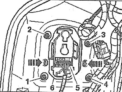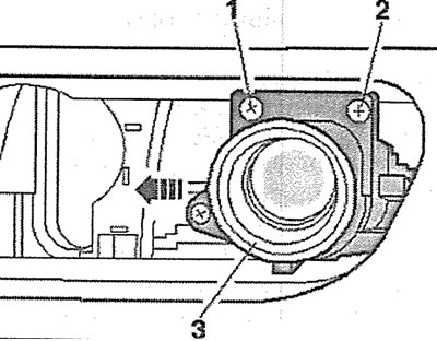 5. Павярніце фару ў напрамку да восевай лініі аўтамабіля (гл. стрэлкі на ілюстрацыі), адлучыце штэкер на тыльным боку фары і акуратна выміце яе з мантажнага месца.