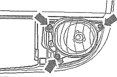 20. Аўтамабілі выпуску з кастрычніка 2002 года. Выкруціце балты (гл. стрэлкі на ілюстрацыі) мацаванні противотуманной фары і акуратна выміце яе з бампера.