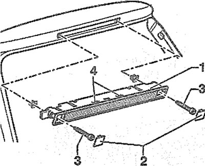 28. Выміце дадатковы стоп-сігнал з мантажнай адтуліны, адціснуўшы якія фіксуюць ланцужкі 4 (гл. ілюстрацыю 13.26), адлучыце штэкер.