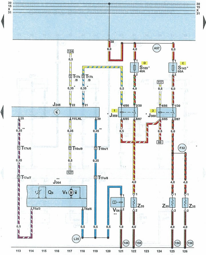 | Т17k | 17-кантактны штэкер чырвонага колеру на блоку засцерагальнікаў і рэле пад абцякальнікам |