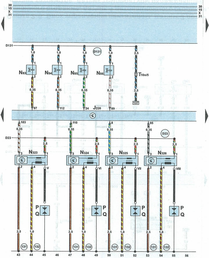 | D131 | злучэнне 15 у джгуце правадоў маторнага адсека, абароненае засцерагальнікам 32 |