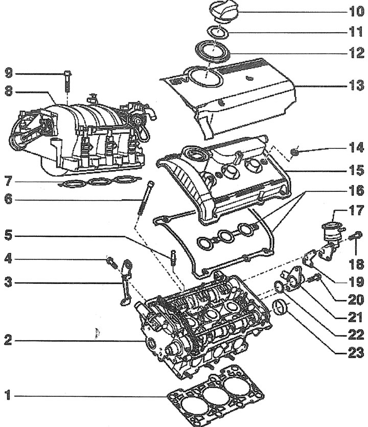 14 - гайка мацавання вечка галоўкі блока цыліндраў. Момант зацяжкі - 10 Нм