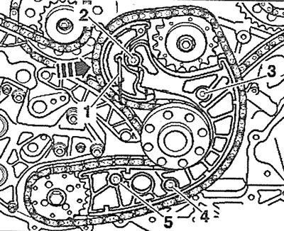 6. Націсніце на ланцуг у кропцы, адзначанай стрэлкай на ілюстрацыі, і ў гэтым становішчы зафіксуйце нацягвальнік ланцуга прывада алейнага і вадзяніка помпаў свердзелам 1 дыяметрам 3,3 мм, уставіўшы яго ў адтуліну на корпусе нацягвальніка.