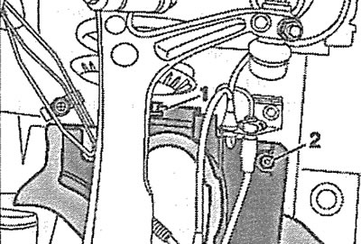 3. Выкруціце ніт 2 мацавання ахоўнага шчытка над левым прывадным валам і зніміце шчыток, вывеўшы з зачаплення 1 (гл. ілюстрацыю).