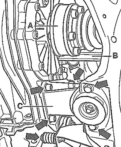4. Выкруціце балты мацавання левага прываднага вала А да каробкі перадач і зрушыце вал у бок (гл. ілюстрацыю). Вал рэкамендуецца падвязаць да кузава, каб ён не правісаў.