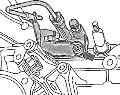 7. Выкруціце ніт мацавання працоўнага цыліндру счаплення (гл. стрэлку на ілюстрацыі) і падайце цыліндр разам з падлучаным трубаправодам назад. Ніт мацавання цыліндру варта замяніць на новы.