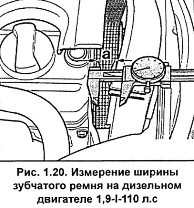 Вымерайце шырыню зубчастага рамяня (гл. мал. 1.20). Пры шырыні рамяня меней 22 мм яго неабходна замяніць.