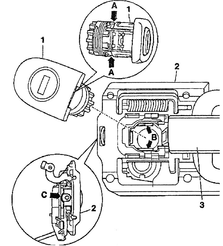 1. Личинка замка двери. Вытянуть ручку наружу и удерживать ее в этом положении. Отвернуть болт «стрелка С» против часовой стрелки торцовым ключом «Т10072» до упора. После отворачивания болта ручка двери фиксируется в вытянутом положении. Вынуть личинку замка вместе с ключом из крепления ручки двери